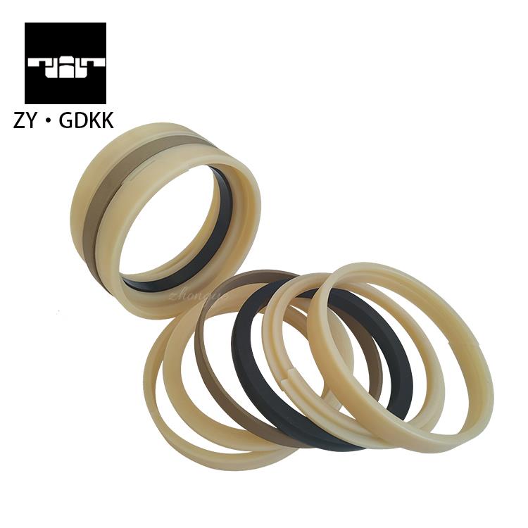GD1000K(GDKK)組合密封件是由兩個導(dǎo)向環(huán)、兩個擋圈、一個彈性橡膠圈和一個密封環(huán)組成。導(dǎo)向環(huán)起定位與導(dǎo)向作用,擋圈起到支承和定位作用,彈性橡膠圈提供彈力并補償密封環(huán)的磨損,密封環(huán)與油缸內(nèi)孔形成配合對偶面而產(chǎn)生密封效果,適用于油缸活塞的密封。